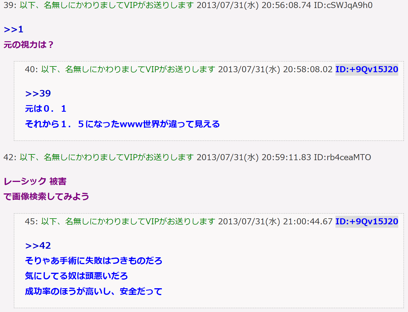 今までは、レーシック手術を受けた方の体験ブログを紹介してきましたが、今回は2ちゃんねるに投稿されているレーシック手術体験者の声をまとめてみました。